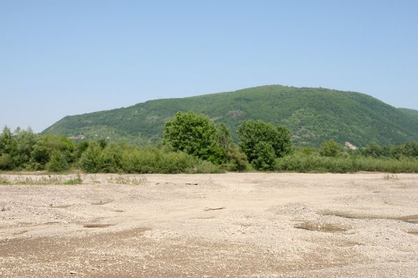 Štěrkové náplavy Tisy o obce Vinogradiv. V pozadí masiv Čorne hory.