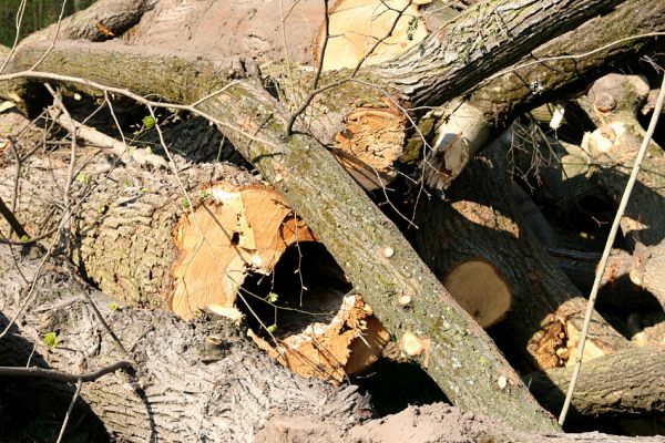 Svoziště pokácených kmenů u cesty od zámku k hájovně.