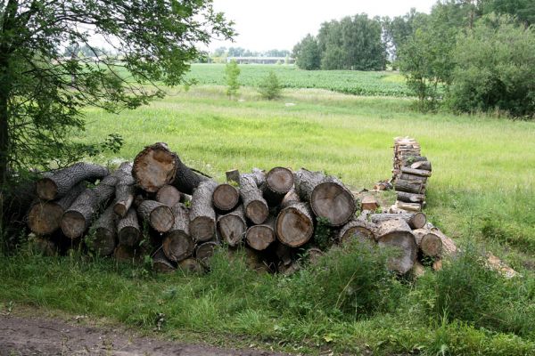 Skládka topolových kmenů ze zlikvidované aleje nedaleko rybníka Baroch. Na kmenech aktivují krasci Agrilus ater a tesaříci Xylotrechus rusticus.