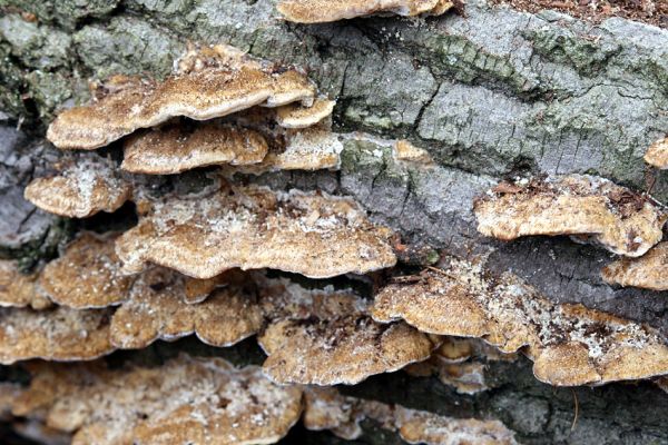 Skládka topolových kmenů ze zlikvidované aleje nedaleko rybníka Baroch. Plodnice dřevních hub dokladují to, že zde kmeny leží již delší dobu.