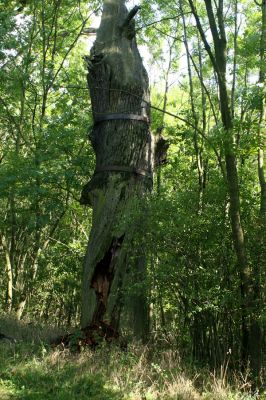Dubová alej na hrázi zaniklého rybníka Rozkoše. Otevřená dutina v mrtvém kmenu prastarého dubu.