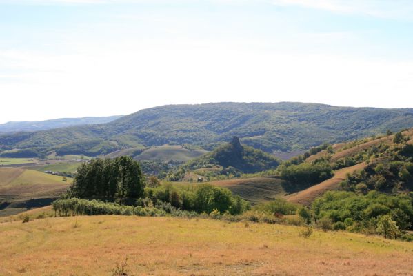 Cerová vrchovina - vrch Zaboda. Pohled přes Hajnáčku na Pohanský hrad.
