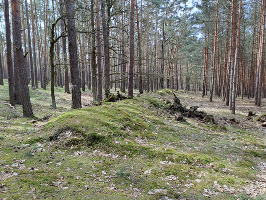Borová monokultura - stopy po starých valech s borovými pařezy.