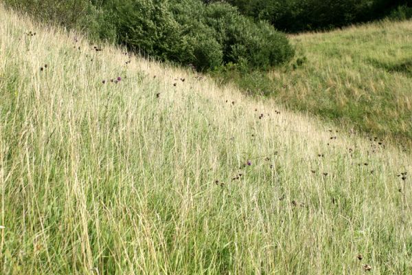 Step severovýchodně od obce. Biotop kovaříka Agriotes gallicus. Detailní pohled na traviny s prorostlé bodláky.
