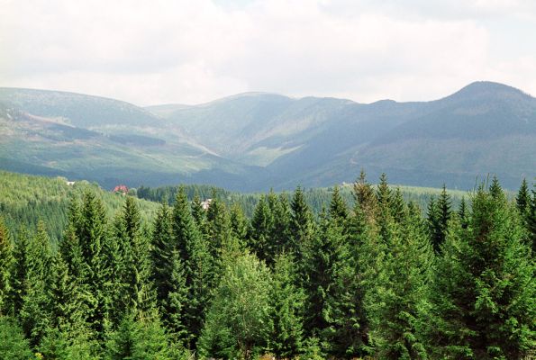 Pohled od Medvědí boudy na Důl Bílého Labe, Kozí hřbety a Luční horu. Zde zuří lesnická válka...