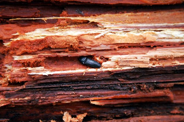 Trouchnivý smrk na holoseči pod bývalou Kamzičí chatou. Kovařík Ampedus aethiops.