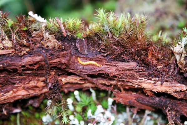 Trouchnivý kmen smrku na prameništi pod Ovčárnou. Larva kovaříka Ampedus auriipes.