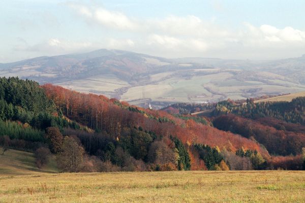 Pohled z vrchu Vršek na kostelík v obci Brumov-Bylnici. V pozadí masiv Tarantové a Holého vrchu.