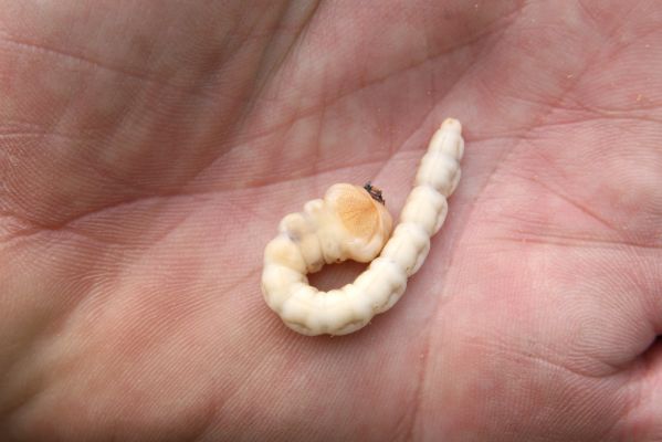 Vojenské cvičiště. Pařezy odstraněných borovic osídlil krasec Chalcophora mariana. Larva krasce.