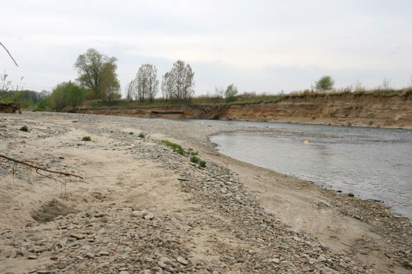 Rozsáhlé štěrkové a písčité náplavy Bečvy východně od obce Prosenice. Na protějším břehu dravé jarní vody pomalu obnažují prastarý zkamenělý kmen.