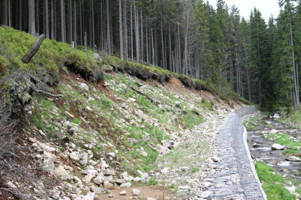 Sutý břeh Malé Úpy v údolí pod vrchem Haida. Biotop kovaříka Orithales serraticornis. Břeh byl zpevněn kamennou zdí. Teď už jen zbývá osázet jej smrčky...