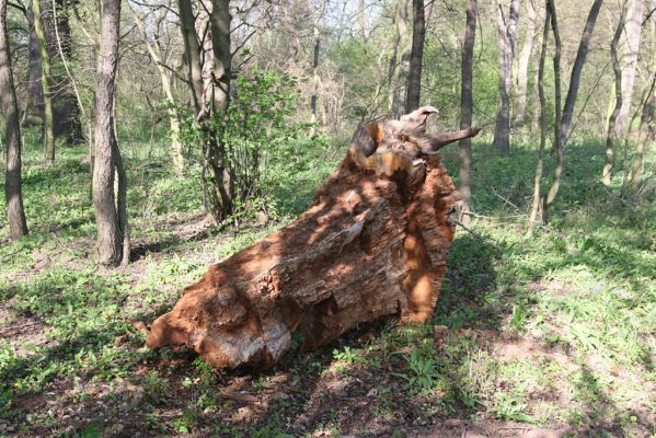 Duby na Souškách. Torzo kmene dubu osídlené larvami kovaříků Ampedus sp.